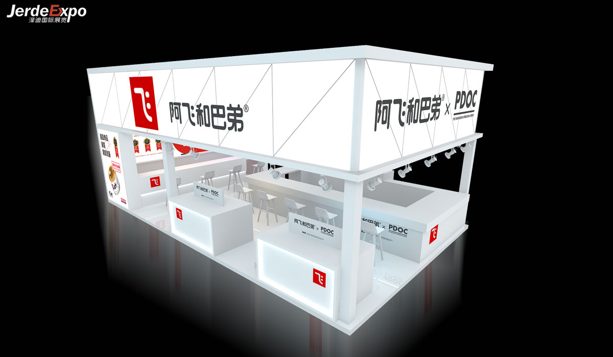 整體設計理念:阿飛與巴弟位于H-2號館“B1618”本次展臺占地面積為60平方米,四面開布局,色彩延用品牌色-白色,輔助色黑色+紅色,簡單 簡約 大氣風格是阿飛與巴弟一直以來慣用風格,門頭使用發光軟膜材質,整體使用白色光源在夜場中就是展會中最亮的仔!